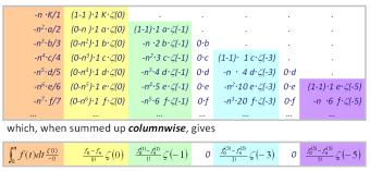 Euler-MacLaurin-summation formula by ZETA-matrixThe Euler-MacLaurin summation formula is a classic and powerful form of representation for the sum of a function at consecutive arguments. After I'd found the ZETA-matrix as representation for the integrals of the Bernoulli-polynomials I got aware that we deal with the same entities here and found the Euler-MacLaurin-summation formula as a simple reordering of summation when the ZETA-matrix was again used. See Euler MacLaurin by ZETA-matrix Keywords: Euler-MacLaurin formula, Bernoulli polynomials, Zeta-matrix