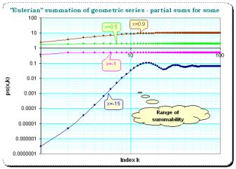 A matrix-method for divergent summation using the matrix of Eulerian numbers The Eulerian numbers are known to be interesting creatures in the combinatorics, and can also be found in the analysis of the problem of summing of like powers. The factorially rowscaled matrix of Eulerian numbers can even give a summation method for divergent series which is comparable with the Borel-summation insofar as it can sum not only the alternating geometric series of any order but even the alternating hypergeometric series 0!-1!+2!-3!+...-+... for which L. Euler had proposed the first meaningful result. That summation-method resulted from intense selfstudy of that matrix and seems to be a regular method even although it does not use the "rowfinite" version. The first discussion of that matrix and an introduction into the summation method see Eulerian matrix A further indepth study of the remaining non-summable series gave more interesting results, for instance how does the summation method transform the given series (even if cannot finally assign a sum): for the divergent nonalternating geometric as well as for the divergent nonalternating Dirichlet-/Zeta-series. Keywords: Eulerian numbers, matrix summation method, divergent series