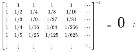 The inverse of this matrix M is the Null-matrix? In a discussion in the mathematical exchange on MSE I was triggered to look at the problem with an proposed attempt to define the inverse of an infinite matrix. The question was whether such an inverse can meaningfully be defined when the inverses of increasing finite size are observed and if they (seem to) converge to a fixed pattern of entries. To understand and then to approach the problem I tried a special, but simple (Vandermonde-like) matrix M to get its supposedly formal reciprocal W ... and that inverses with increasing finite size... ... seemed to come out to be completely near zero. I discussed this with the help of the L D U-matrix-decomposition. The L-D-U-components are triangular and have for any finite truncation the same pattern of entries. Also they have well defined triangular inverses which are also always invertible and thus have a natural generalization to the case of infinite size. The formal dot-product, or better: the analytical description of the formal dot-products gave now an infinite, and highly nontrivial, set of identities (involving the Stirling numbers 1st kind) where the first dozens of empirically tested formulae indeed evaluated to zero. I could also decypher the much likely correct analytical expression for the involved dot-products by the involved not too exotic patterns of numbers. A general formula for each entry of the resulting infinite matrix W is given, but I did not get a general proof yet, that indeed all formulae come out to be zero. See "infinite Nullmatrix as inverse of M" Just recently ( Aug 2014) a contributor in MO provided a proof which can easily be usded in an induction. See (MO) an infinite set of identities are they all zero?