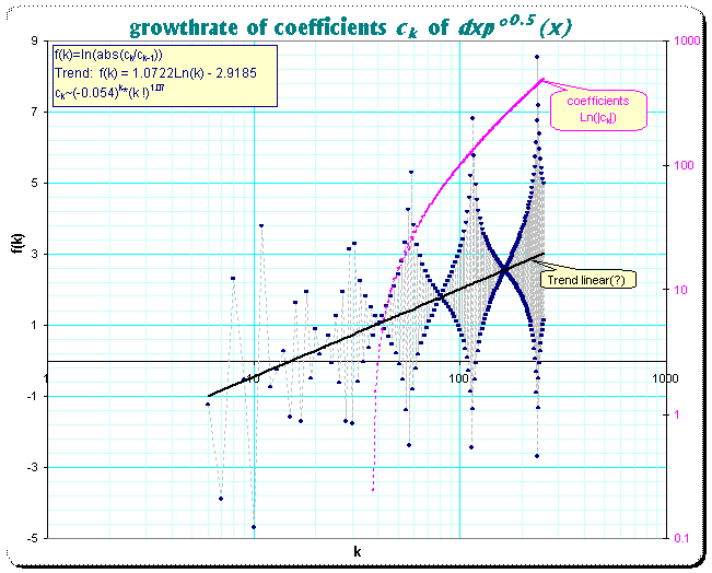 However, it is possible that this is still only a local approximation. It seems, that the growthrate of the terms is even more than hypergeometric; a plot of the quotients of successive coefficients indicates strongly, that in the average the coefficients grow dependent on the index k like O((k!)1+δ) (with oscillations) where if δ>0 significantly the used Noerlund-summation is not strong enough. The following plot shows the growthrate by the formula