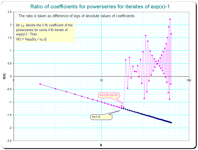 decreases linearly with the index k, which reflects, that the ratio r(k) of two coefficients of the powerseries for exp(x)-1 at the index k is just (k-1)!/k! = 1/k and thus the represented function